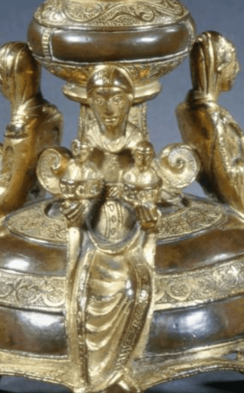 Details of the Hildesheim candlesticks with allegorical figures associating Scientia with Africa (left), and Theorica and Practica (right) with Medicina, 12th century. Source: Fotograf*in: Christian Tepper; https://www.bildindex.de/document/obj20313186, accessed 25.i.2026.