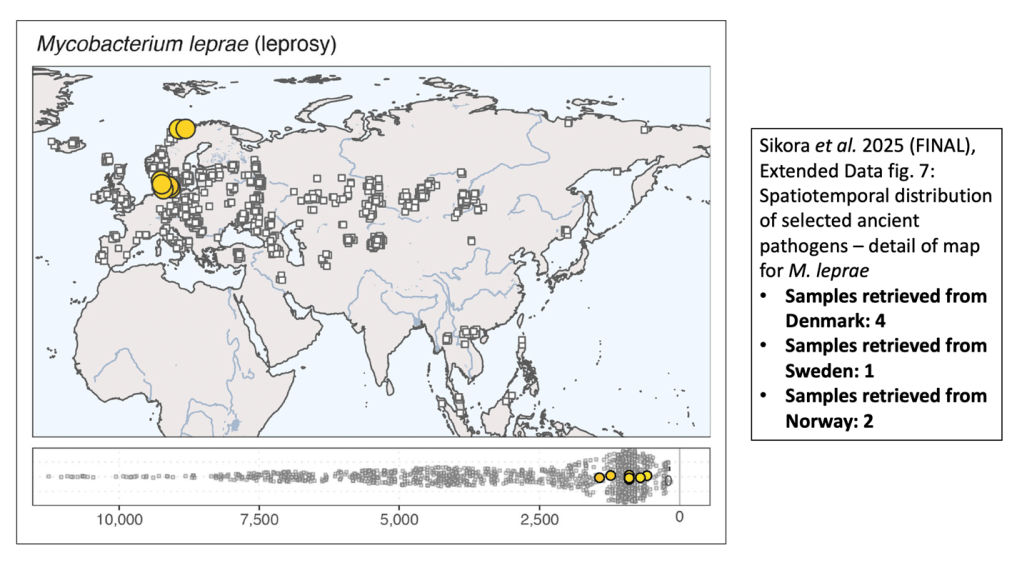 Sikora, Martin, Elisabetta Canteri, Antonio Fernandez-Guerra, Nikolay Oskolkov, Rasmus Ågren, Lena Hansson, Evan K. Irving-Pease, Barbara Mühlemann, Sofie Holtsmark Nielsen, Gabriele Scorrano, Morten E. Allentoft, Frederik Valeur Seersholm, Hannes Schroeder, Charleen Gaunitz, Jesper Stenderup, Lasse Vinner, Terry C. Jones, Björn Nystedt, Karl-Göran Sjögren, Julian Parkhill, Lars Fugger, Fernando Racimo, Kristian Kristiansen, Astrid K. N. Iversen, and Eske Willerslev. “The Spatio-temporal Distribution of Human Pathogens in Ancient Eurasia,” Nature 642 (24 Jul 2025), 1011-1019.